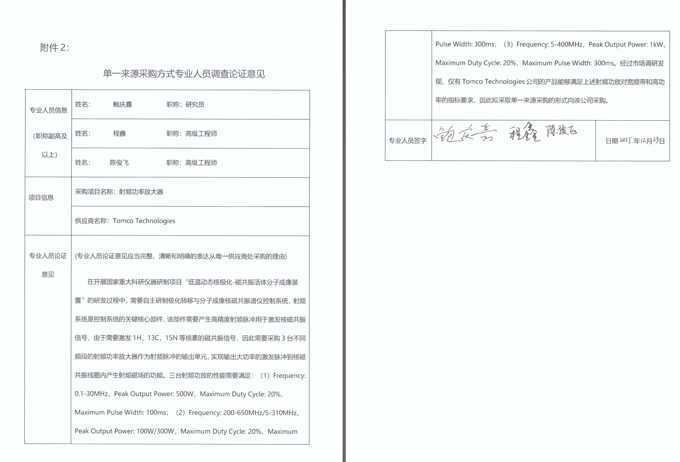 基于科研需求,拟采购3台射频功率放大器的技术参数要求如下。(1)Frequency: 0.1-30MHz,Peak Output Power: 500W,Maximum Duty Cycle: 20%,Maximum Pulse Width: 100ms;(2)Frequency: 200-650MHz/5-310MHz,Peak Output Power: 100W/300W,Maximum Duty Cycle: 20%,Maximum Pulse Width: 300ms;(3)Frequency: 5-400MHz,Peak Output Power: 1kW,Maximum Duty Cycle: 20%,Maximum Pulse Width: 300ms。顺利获得市场调研发现,市场仅Tomco Technologies公司生产的射频功率放大器满足以上需求,拟采取单一来源采购的形式向该公司采购。
